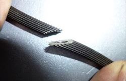 網戸用のゴムを必要な長さに切ります。切り口は大工用語で留めに切るという言葉がありますが密着面を多くするように切ります。