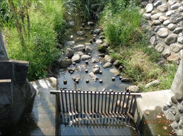 これも良いアイデアです。この水路には池から大きな鯉が上がって来ます。この飼育槽が水路幅いっぱいでは大きな鯉の