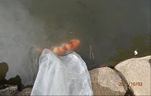 池に浮かべて温度合わせをします。池の水と鯉の入っている袋の水をほぼ同じ水温にします。 |