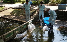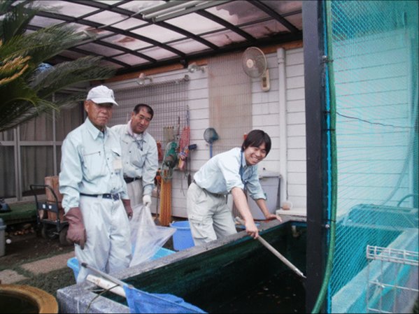 朝10時役場の担当者の方が2名袋詰めを手伝いに来てくれました。50cmクラスがいる外の水槽から袋詰めを始めます。 |