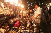 サウナですっきりしたら夜のソウルをぶらぶらします。色々な商品をあつかうお店(露店)が通り一面見事に並んでいます。 |