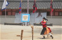 八達門広場では昔の戦いのようすを再現しているかのようなことが行われていました。3月から12月までだそうです。 |