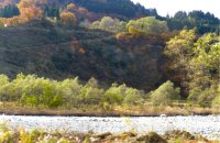 食事を頂き、バスは目的地に向かいます。車窓から見る山は葉が色ずき始まっています。