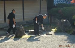 枯山水の庭の手入れをしているようです。若い方ですがこれも修行のうちですかね。
