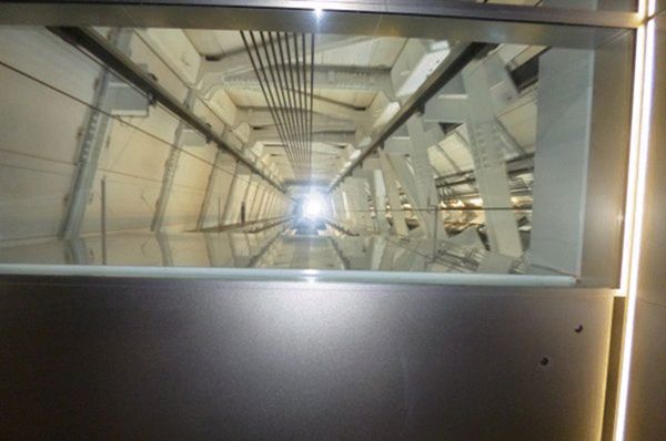 350mから天望回廊に向かいます。エレベーターの天井から空が見えます。洒落た志向です。 |