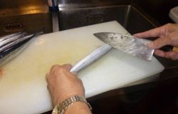 三枚におろしたサンマの皮をむきます。包丁を使いますから無駄なくむけますが、慣れないと逆に無駄が出ます。